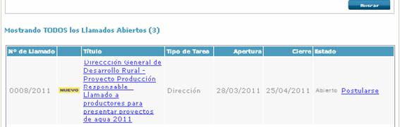 Cada llamado aparecerá en una línea, en la cual se describe el Nº de llamado, Titulo, Tipo de tarea, Período de Inscripción, Estado del llamado.
