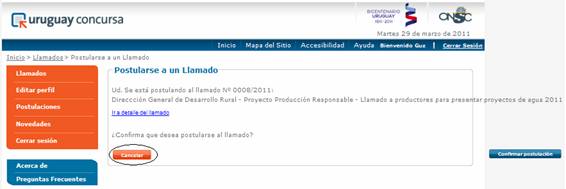 Para dejar sin efecto la postulación, el usuario debe seleccionar “Cancelar postulación”.
