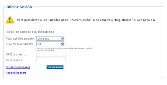 En el caso que el usuario no haya iniciado sesión o no este registrado, cuando quiera acceder a la postulación le aparecerá una pantalla con el siguiente aviso: