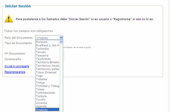 Para seleccionar el País del Documento y Tipo de Documento, existe una lista desplegable la cual se accede seleccionando la flecha gris a la derecha del campo.