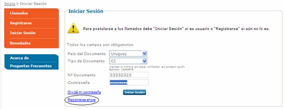 En el caso de que el usuario ya esté registrado, solo debe llenar los campos de datos. Los datos a completar son: País del Documento, Tipo de Documento, Nº Documento y Contraseña.